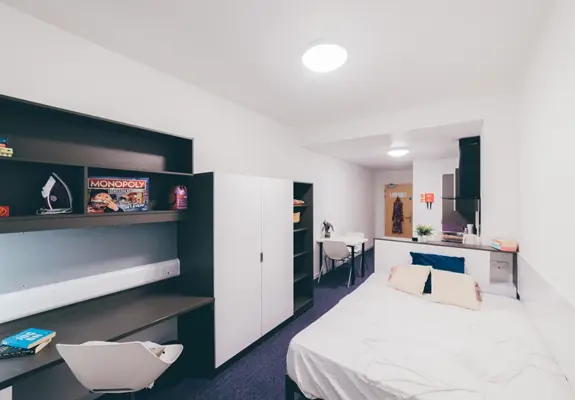 All single rooms are fully furnished with a single bed and mattress (four-foot, small double bed). Plus, you get a desk, chair, bookshelves, a wardrobe, a bin, mirror, and integrated desk light.